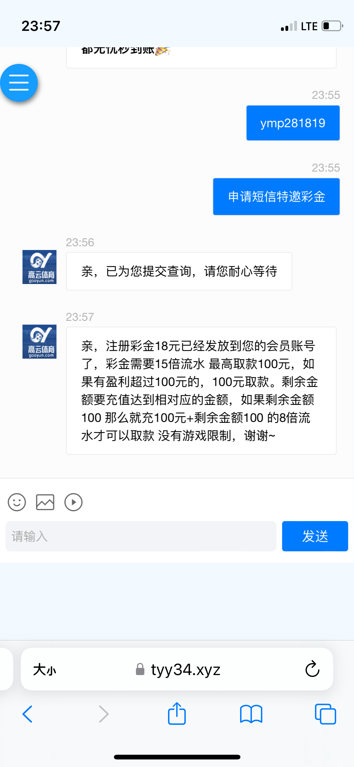 我没有截图,我是直接说申请短信彩金,就给了