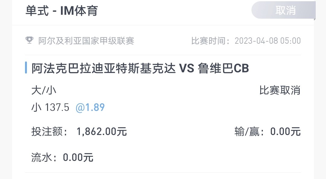 这个取消正常,体彩也会有取消,你们是真就只会下注啊?但是体彩取消会有保底奖,这种台子取消是没有赔付的。不会有什么狗庄故意取消你注单的,你又不是他台子自己开的体育台搞的,而且体育这些都是外围抽水除非你注单特别大,平台得奖之后不想给你赔了黑了,你不管输赢他都有得的东西黑啥