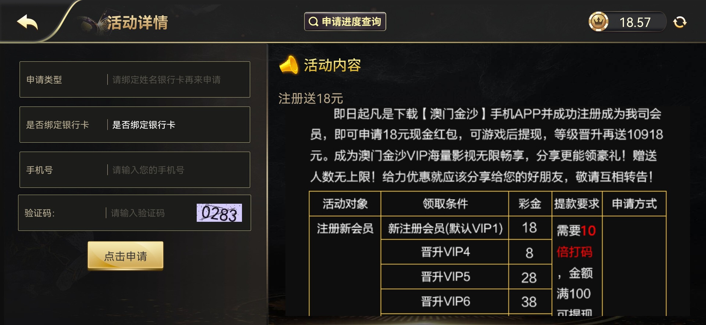 您好,请您点击APP首页下方【活动】-【注册送18元】查看活动规则后自行申请即可哦~谢谢~
