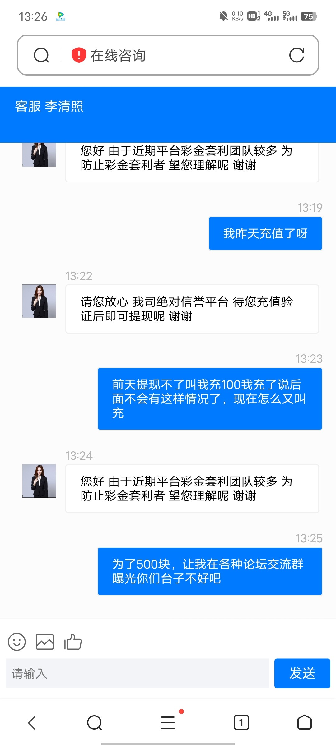 500国际黑台不要充,充100打到500提现要充值,不充直接拉黑了