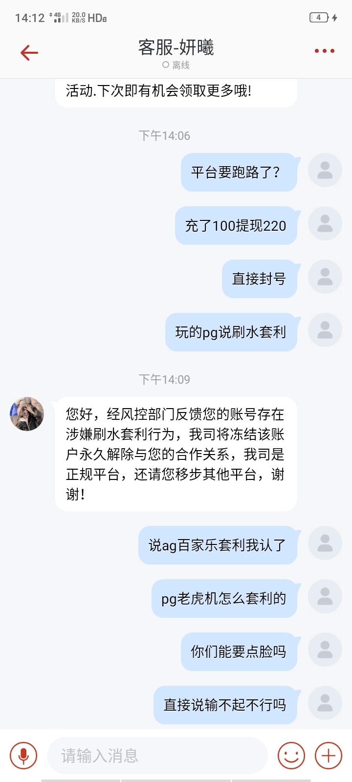 充值100打pg,这个号一直只玩pg,提现220,赢了他120块,直接封号,这平台要跑了
