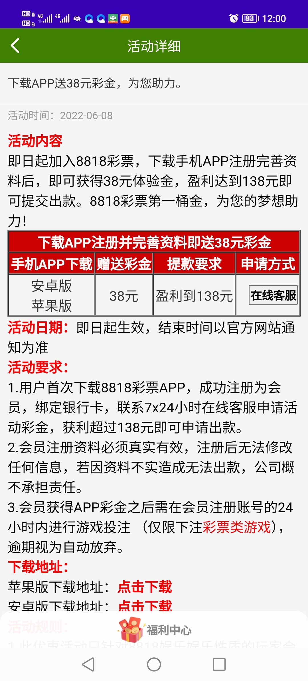 注册就送38,我晚上2:00注册,中午11点上号看有38只能玩彩票,提现秒到账 不好意思,忘记了