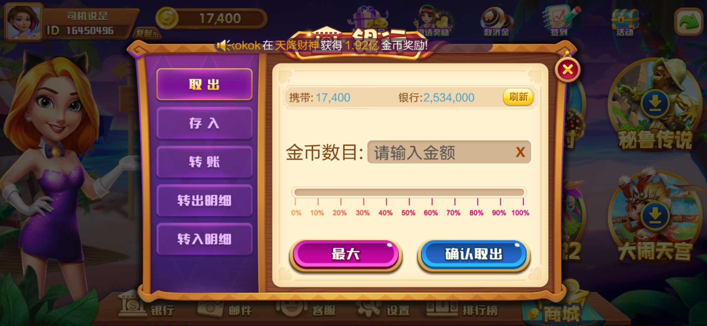 注册,设置银行密码,有18万金币打到180万可以找客服提现100元