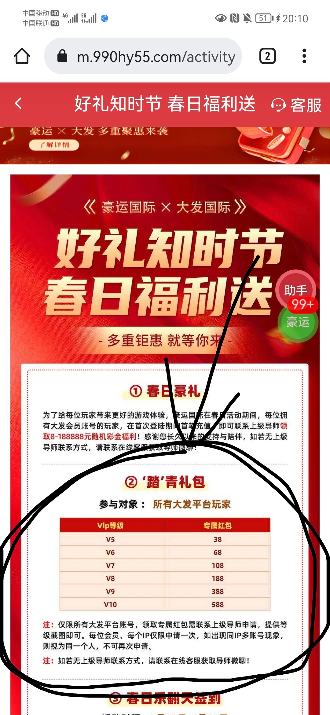 豪运国际踏青礼包根据vip等级免费领38到588元,我领了68元,网址:https://m.990hy55.com