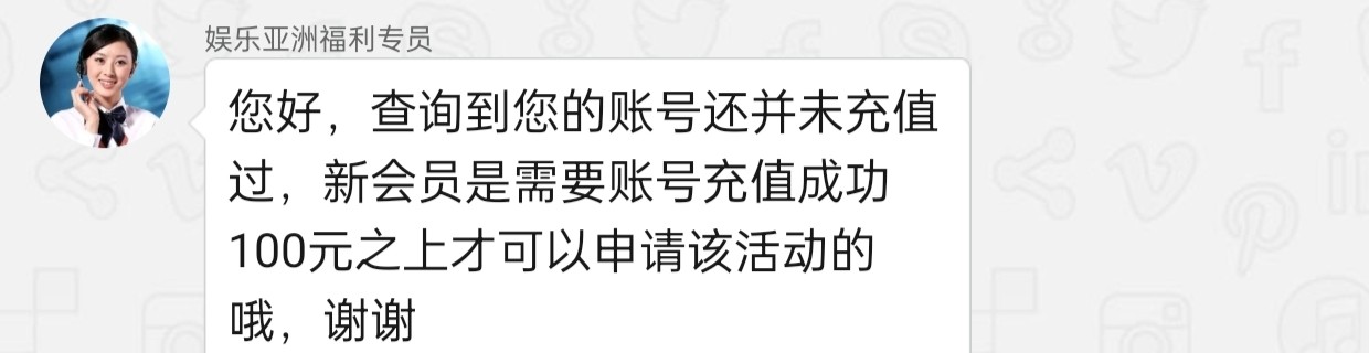 您好,查询到您的账号还并未充值过,新会员是需要账号充值成功100元之上才可以申请该活动的哦,谢谢