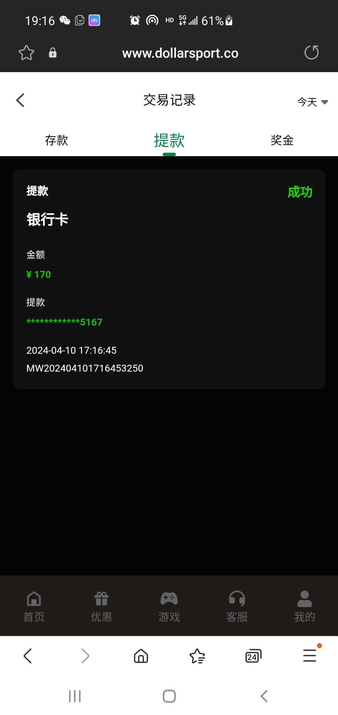 提了170到账