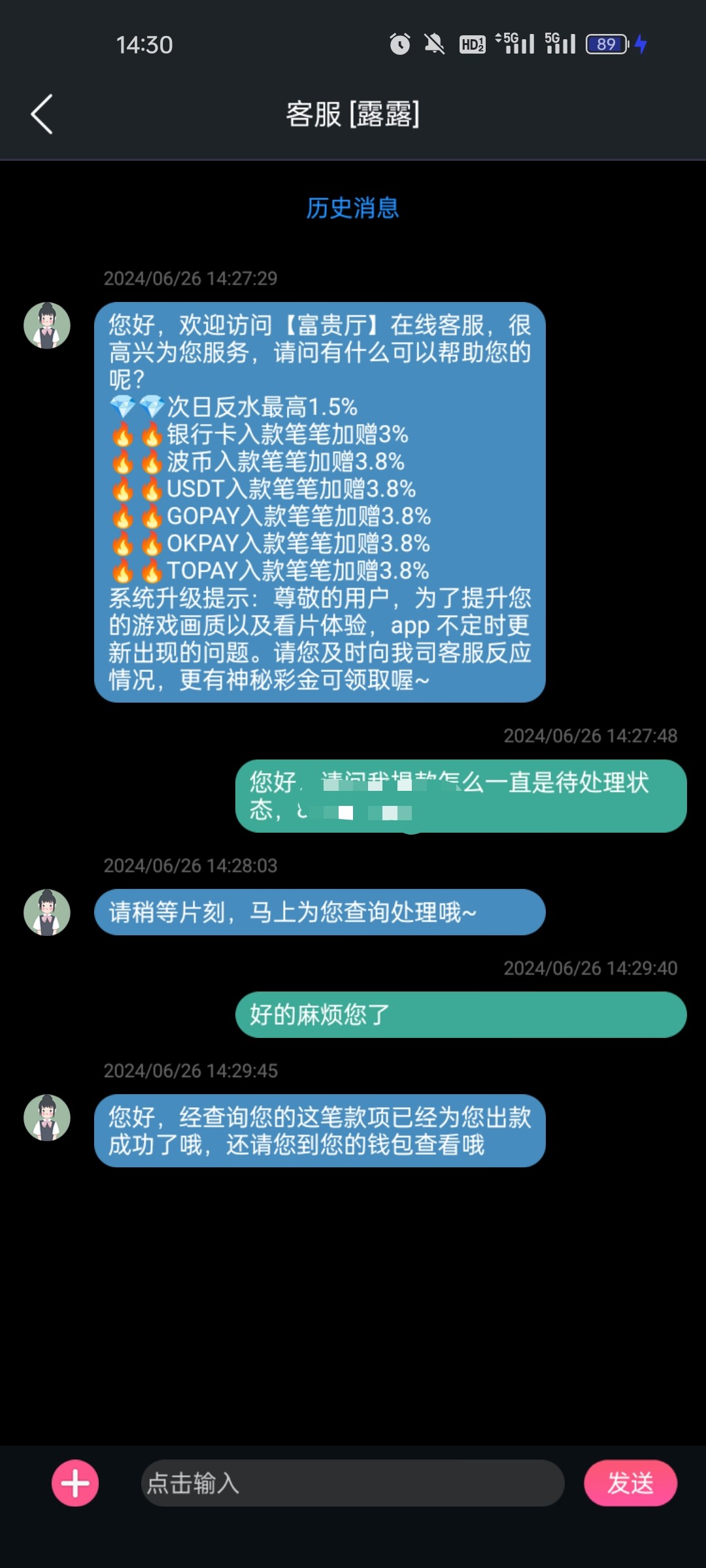qnmgb0 太牛逼了 十分钟打上100 提款两分钟就到了,真的无敌效率