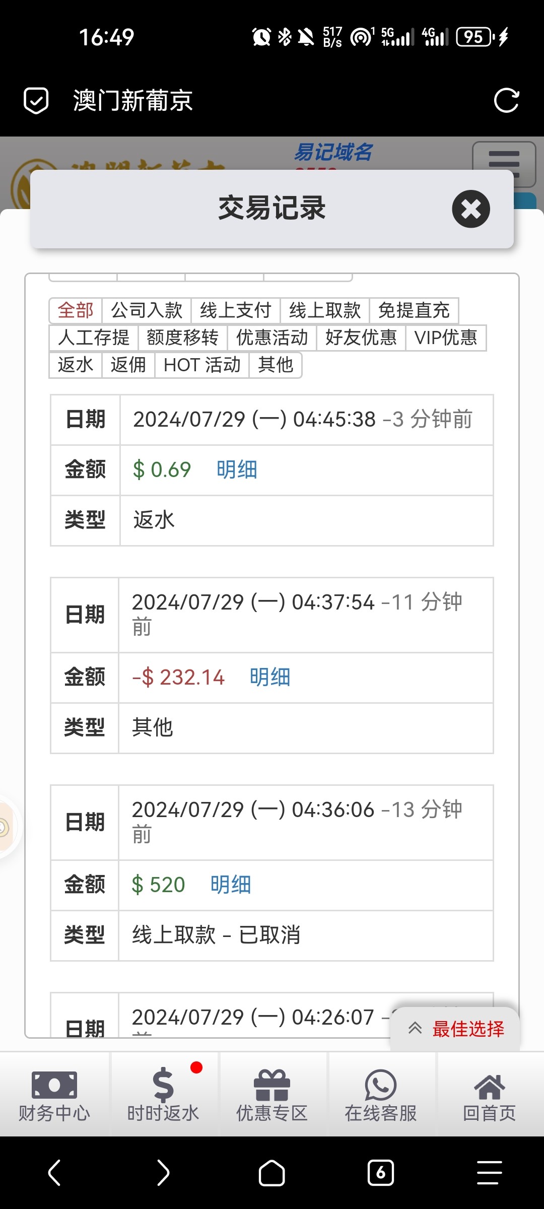 刚刚8558签到2块钱玩日月星辰0.4一拉300倍余额里面50我就退出来充值50进去 充值好账号里面刚好100块钱然后又进日月星辰把刚刚暂停的免费继续打 一下子上到400多块钱