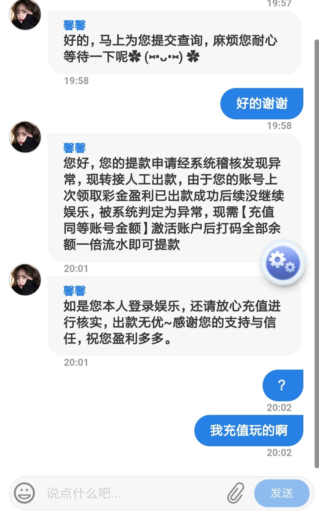 xj9912 黑的 昨天彩金18打没了 今天充值了100  提200 都不给提