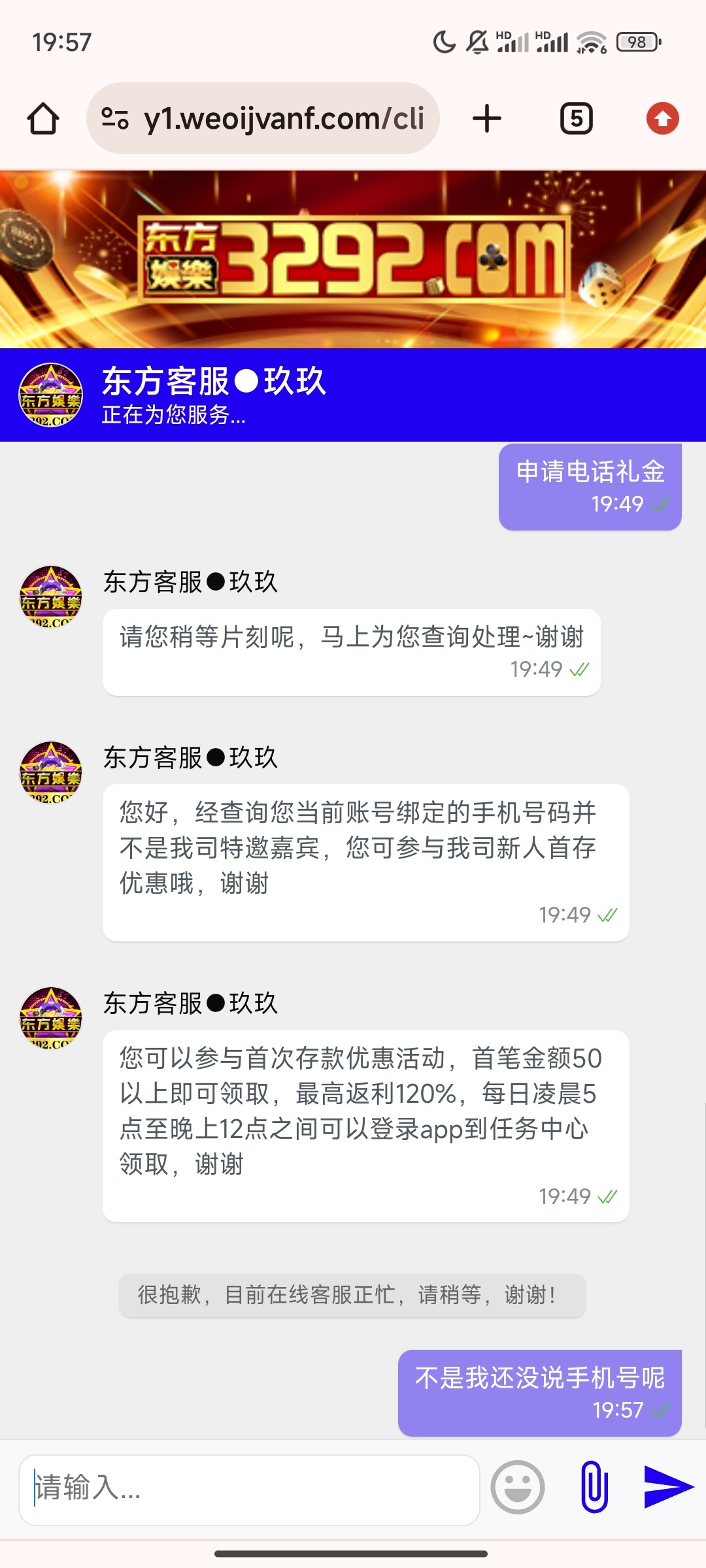 您好,经查询您当前账号绑定的手机号码并不是我司特邀嘉宾,您可参与我司新人首存优惠哦,谢谢。