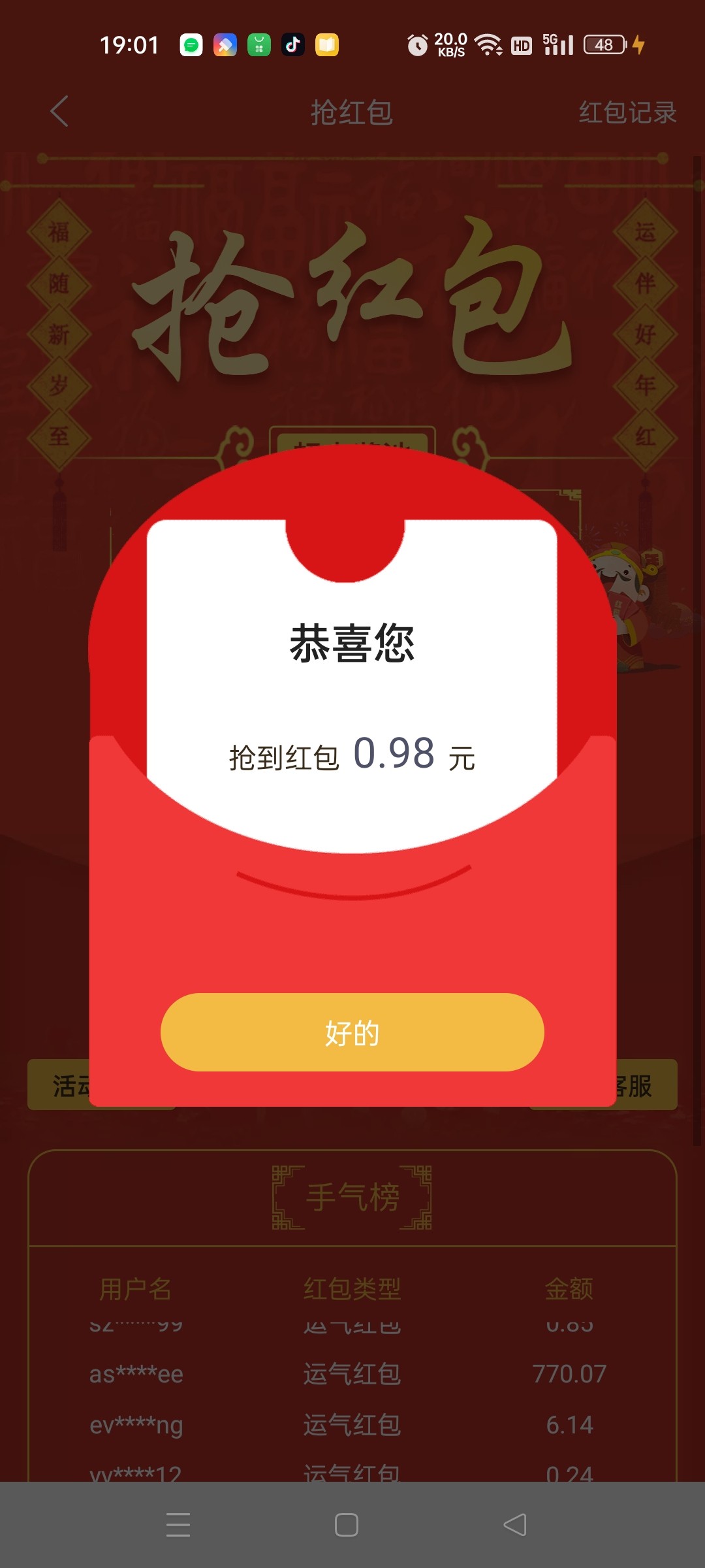 yjh202125 大发红包高点,我稳定每次10左右,不过得保持活跃,不然一下子不不让抢,总的来说输的那些都够多少次抢红包的钱了