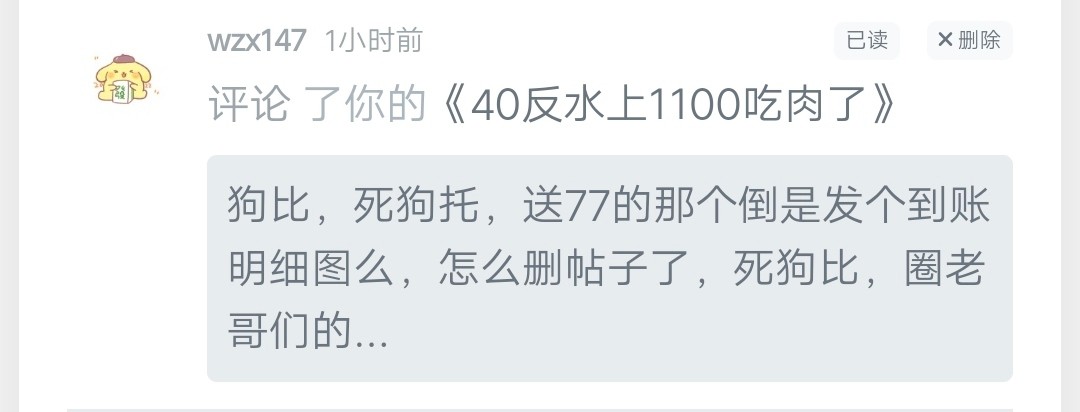 我看你也是病的不轻,40上1000也发个贴装一下,活该被骂,骂得好,贱骨头。你装能不能发个过万的装一下。你们这群野爹没见过1000?
