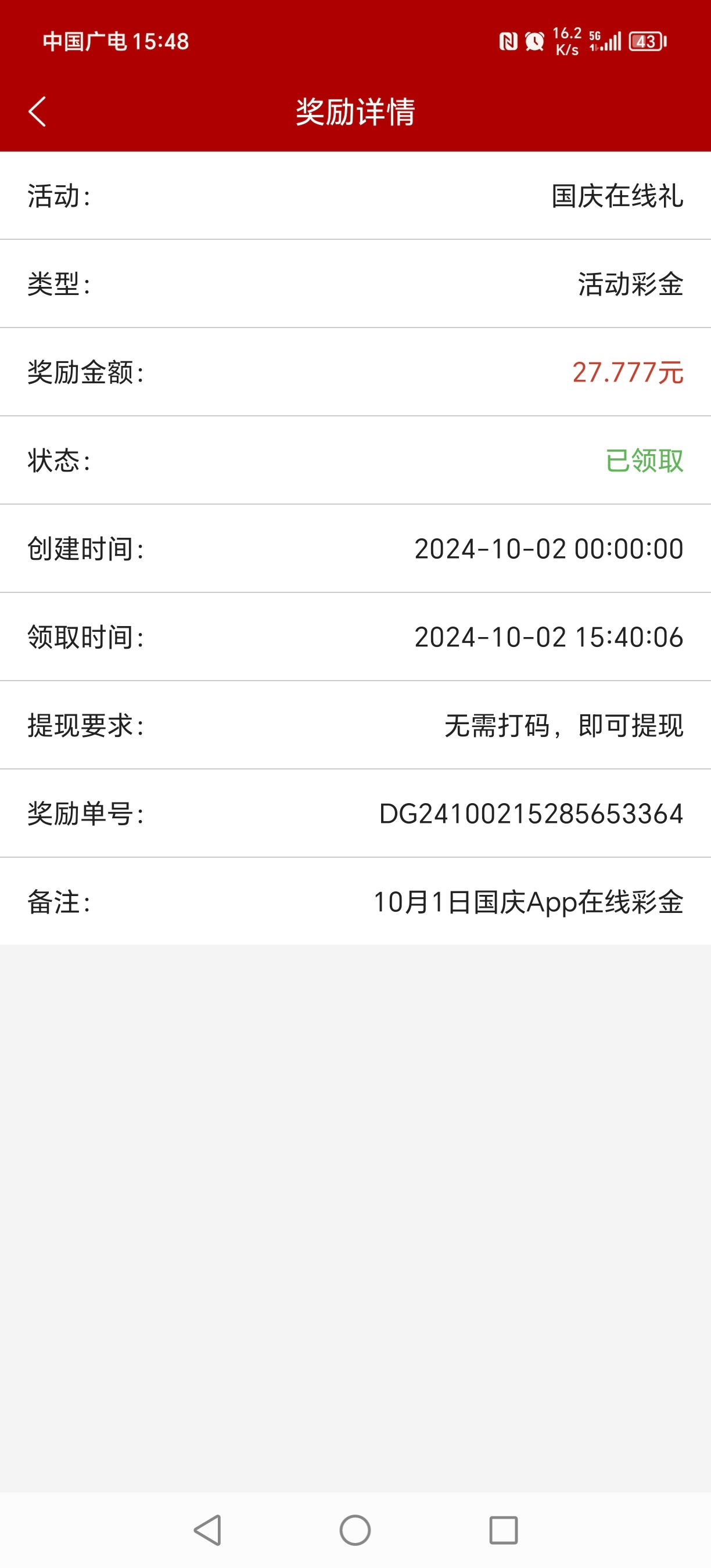 登录彩金27,红包63直接提了93,美滋滋啊,860登录38彩金,011登录48彩金,得吃超级猪脚饭了锦瑟拨弦曲悠扬,牧笛迎风音绵长。玉宇澄清百花开,盛世太平千家芳。长城内外赤旗展,大江南北紫气翔。国庆良辰祝吉祥,万般如意伴君旁。