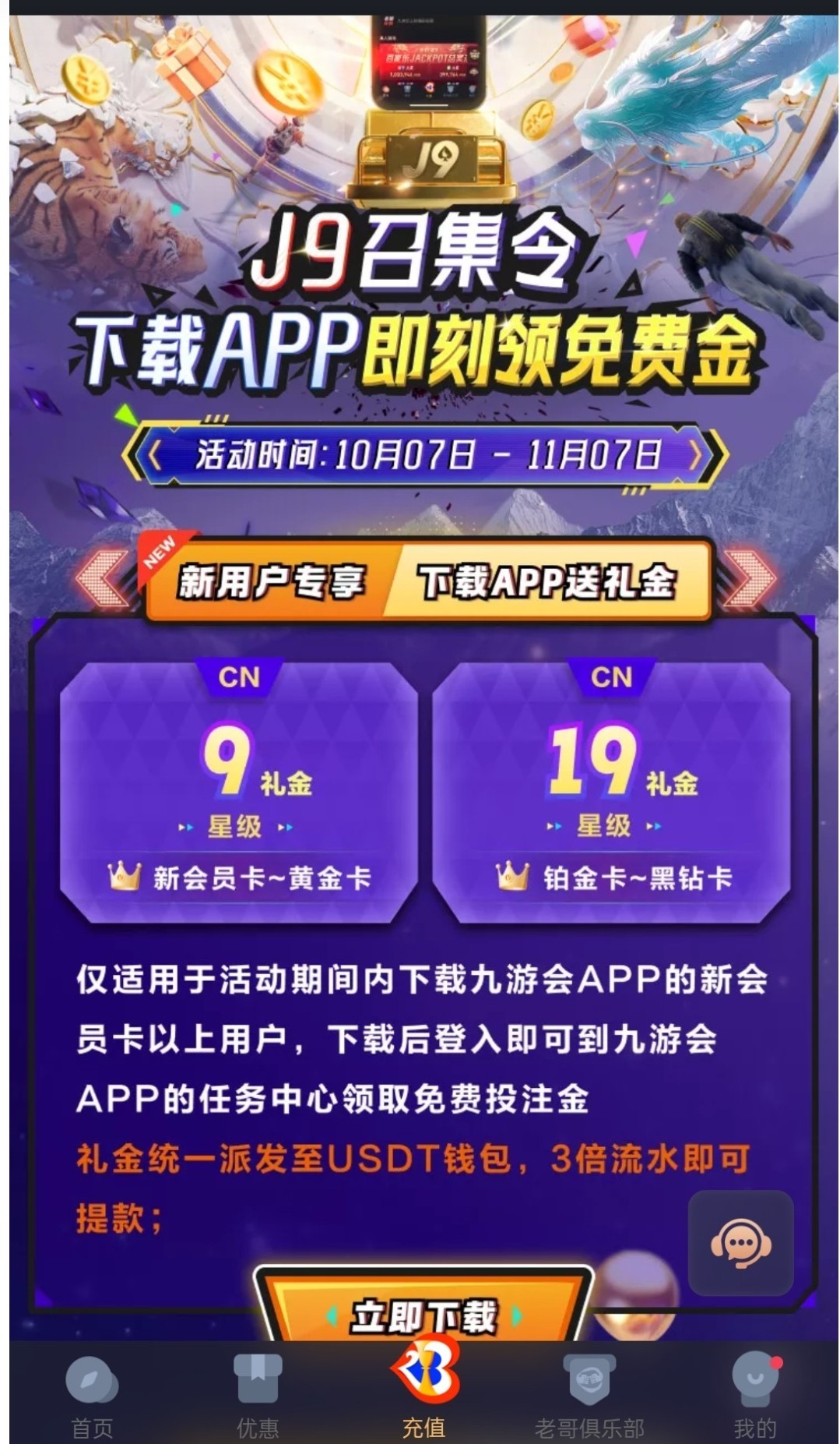 老台新活动,下载app登录任务中心领取, 没充值过的没有,链接J9.com