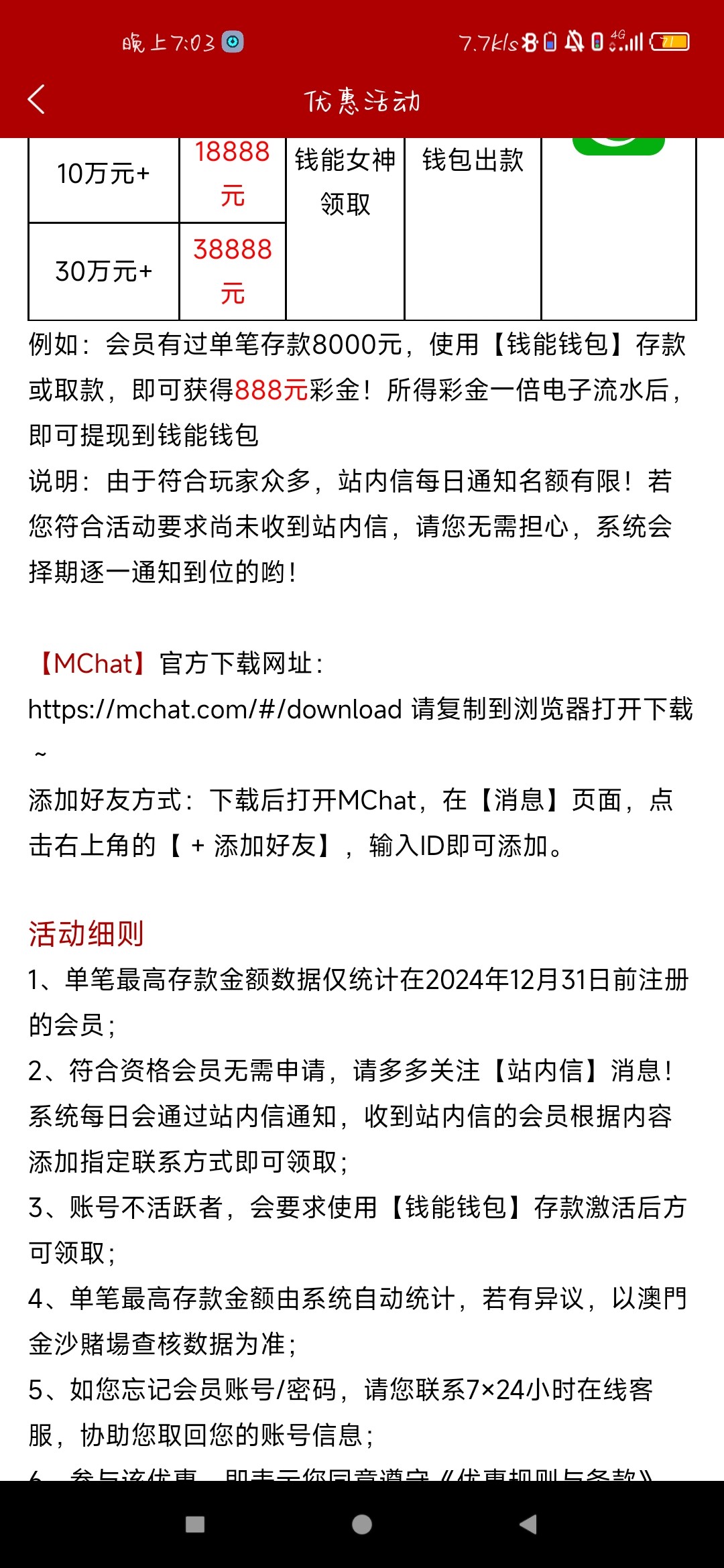 990的女神彩金变成了24年之前的了,在24年才有过单笔的可以试一下了,直接去找客服问联系方式,我之前领不了今天领到了888,慢慢打出了1000勉强能还上这个月的贷款了,后面的就靠生活费还钱了,现在已经赌的麻木了,不敢赌了,希望能够戒掉