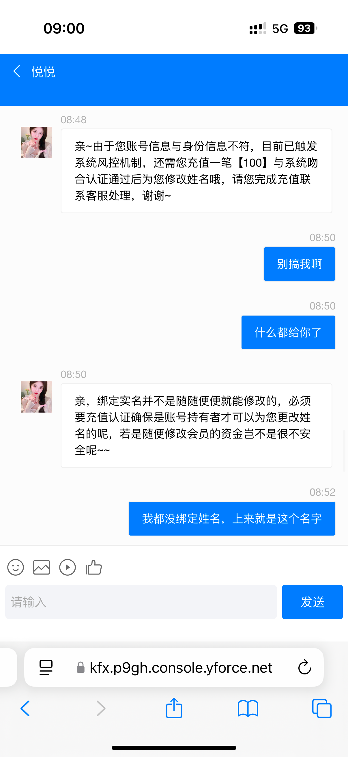 提100叫联系客服,一看注册姓名不是我,让我充100,能充吗老哥们?