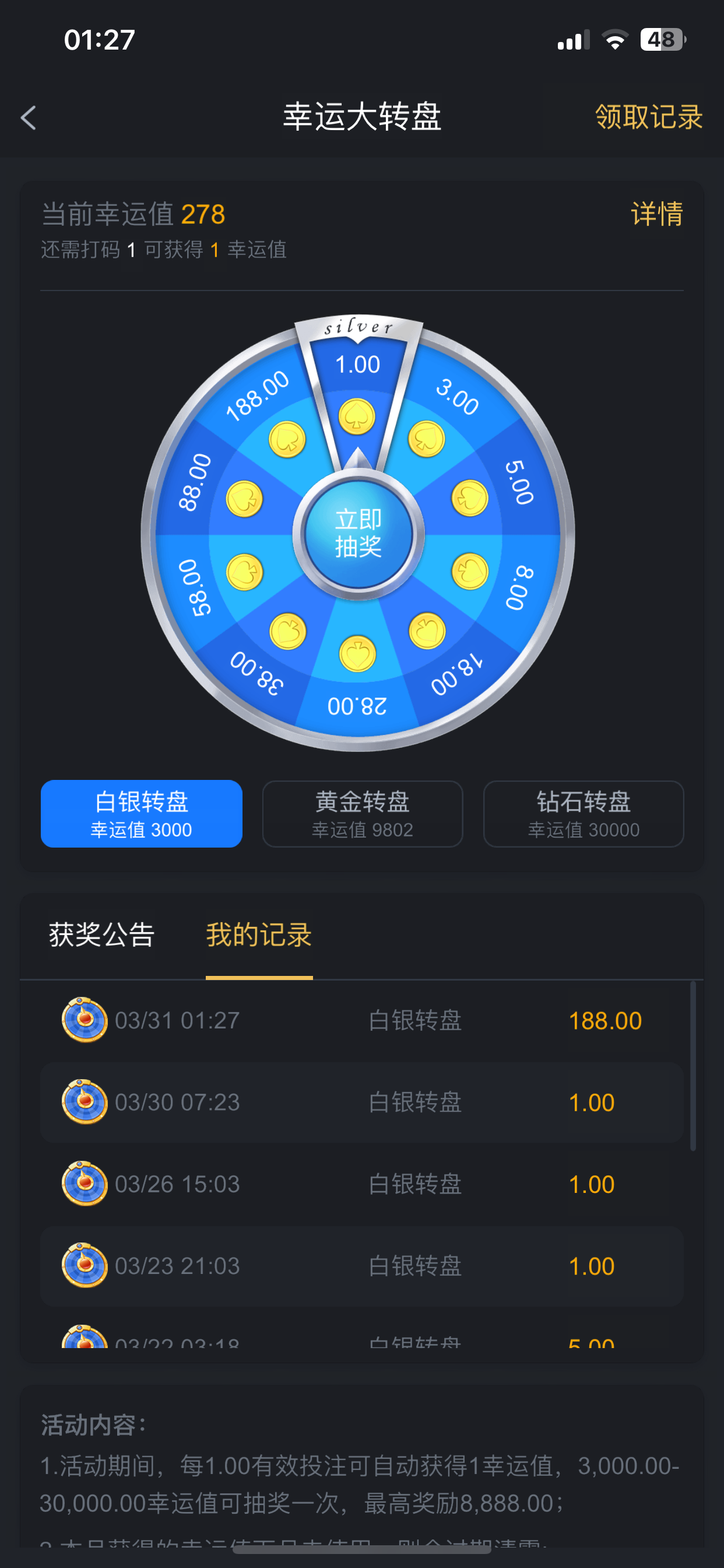 晚上无聊看还有3000多积分没想到转到188,还是有点东西的