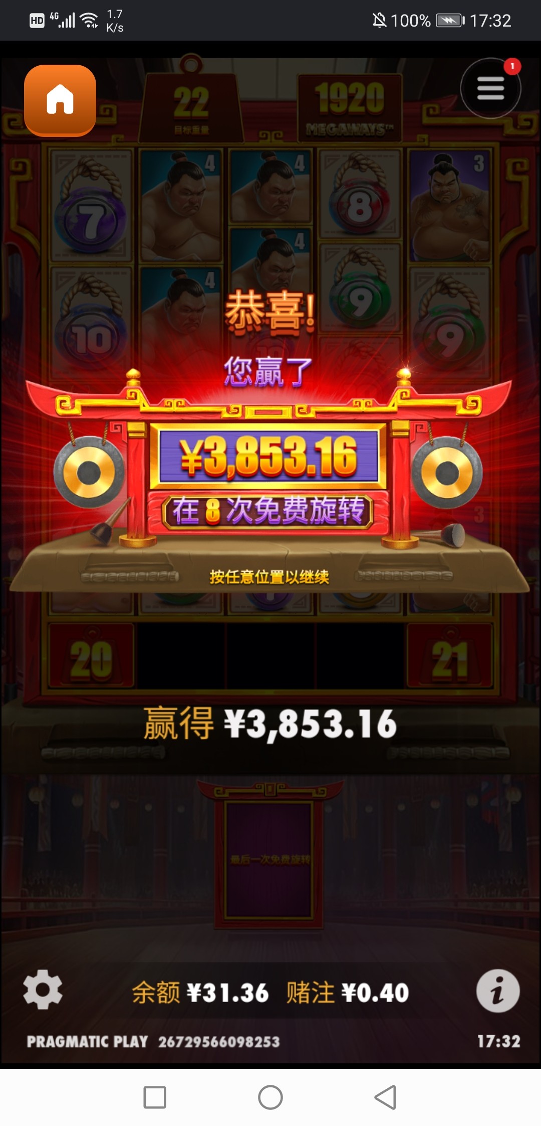 100+50第一次出了800,然后转盘抽了18彩金加上返水什么的,jdb0.8又爆268,出了311 总计100赚1000