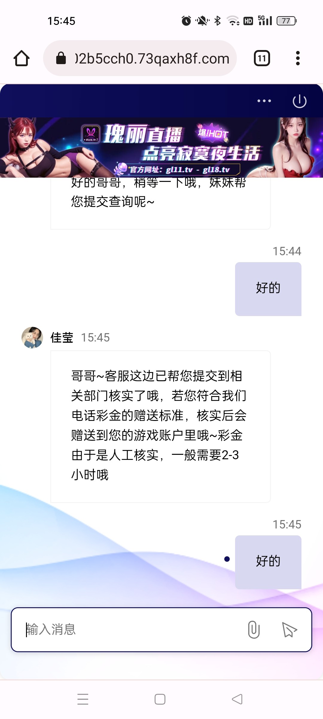不客气哥哥,经查询您的手机号码不在我司电话名单里面的哦,所以您不能申请我司电话彩金的呢,小妹请您在我司多多游戏以提高您的账号活跃度领取属于您的彩金哦~