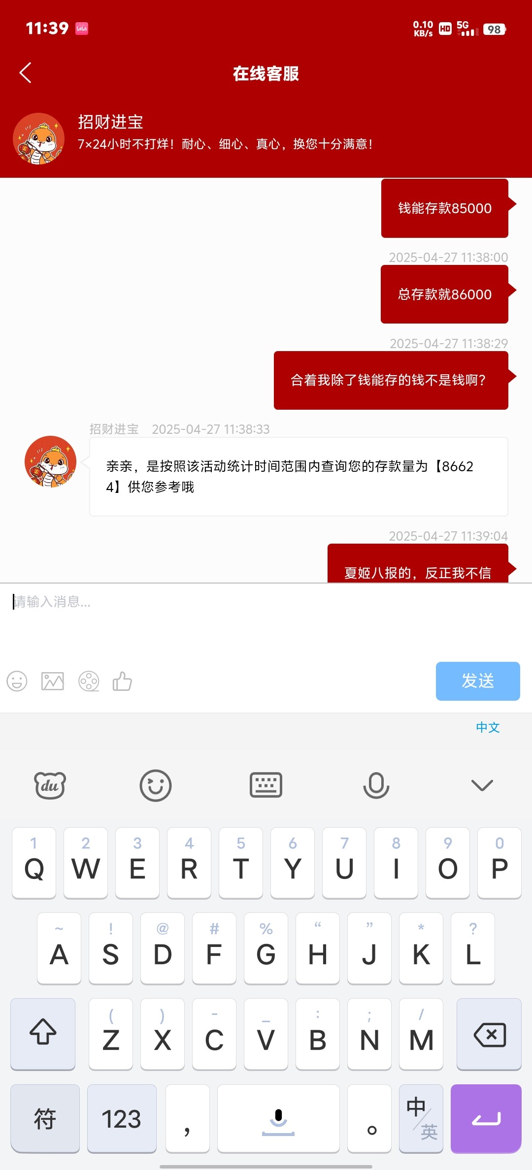 前面问了钱能存款8w5,后面在问总存款只有8w6,取款多少也问不出来,估计客服也明白问他就是想知道我五一能领多少彩金,乱报个数好让我充值,可惜我这个挂壁仔没钱充只有坐等158巨额彩金了