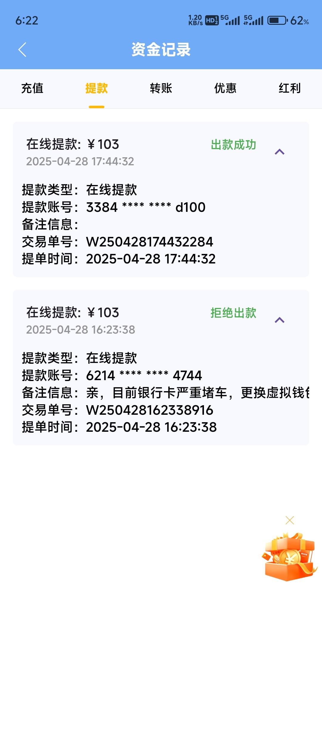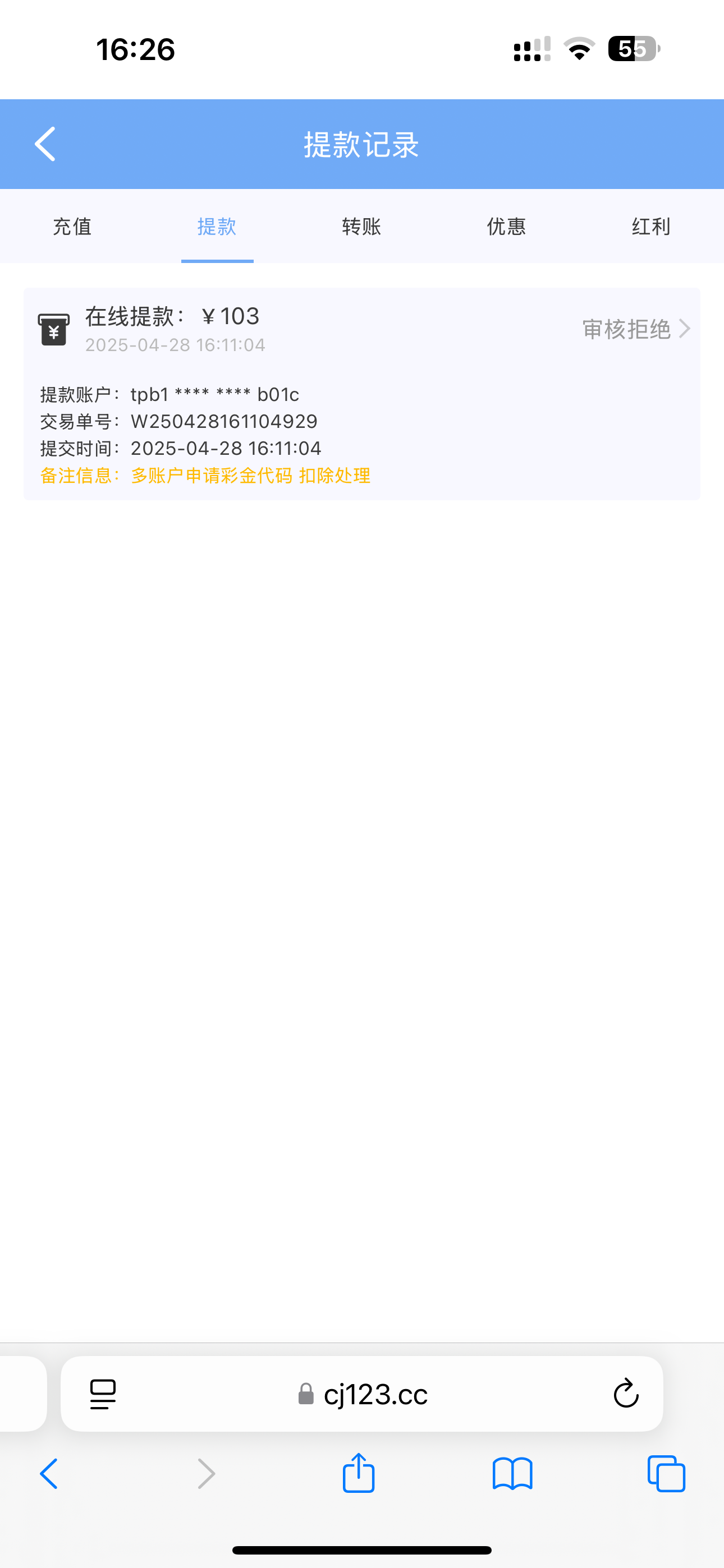 妈的,黑台,不用去了,提现拒绝,说多账户申请彩金代码,老子就一个账号,赶紧下了把