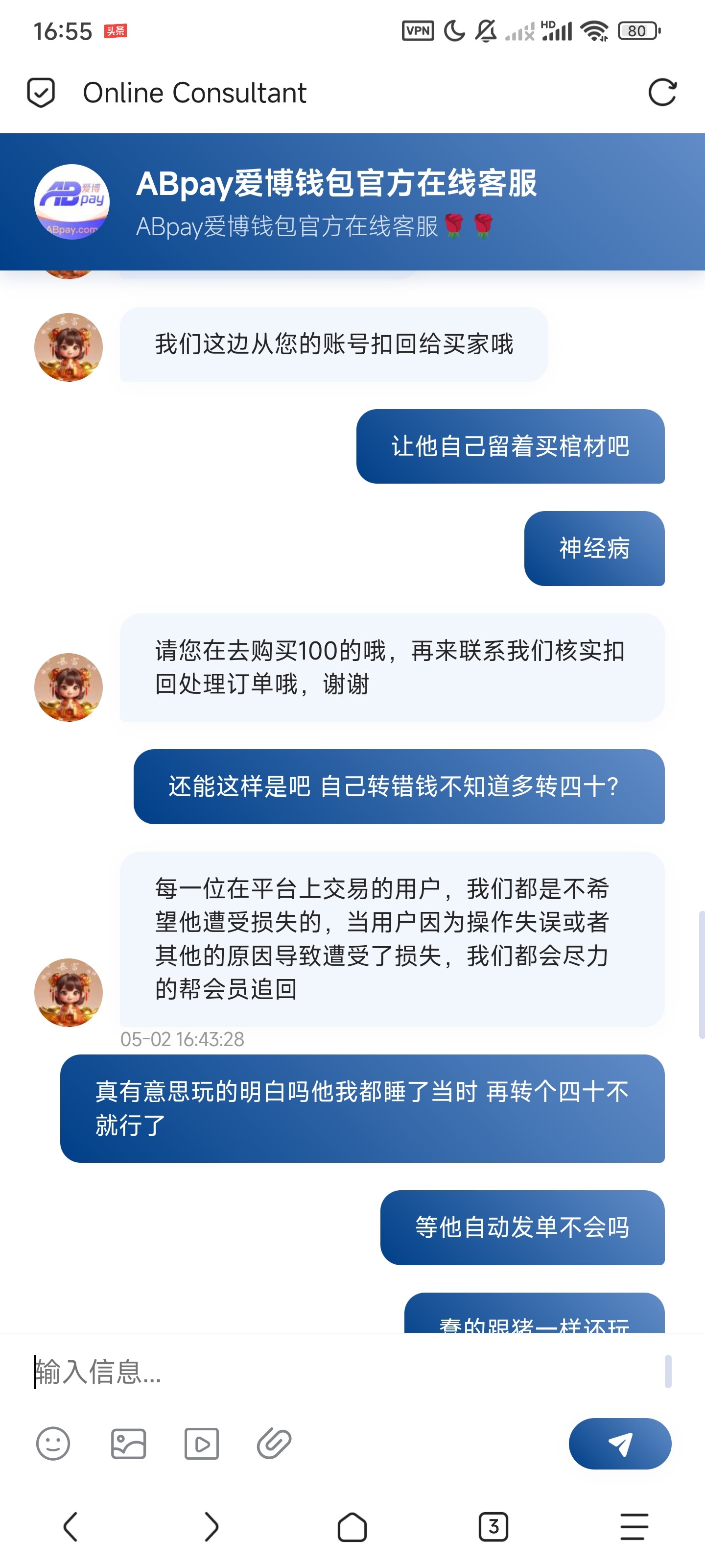 今天凌晨的时候下分卖币 后面睡着了 今天起来支付宝有个蠢猪说转错了 以为转错支付宝就没管 刚才想着上一百玩玩 发现付不了 问客服 客服说这个蠢猪买了240转了两百 真没见过这么蠢的人 提交我都睡着了自动发货都行 这蠢猪居然取消了 现在客服让我再买一百划给他 我不是很想给 你们说是不要这个ab钱包了赚个一百还是说还给他 我真不太想给 这种蠢猪不留着治脑子还玩