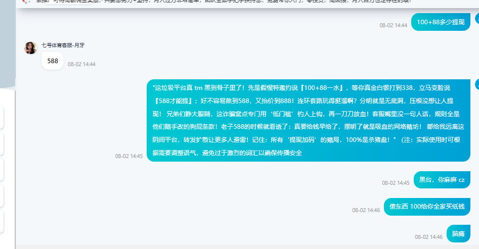 微信来的特邀我进网站客服说100+88一水 刚开始没说588提 我打到338提 退回说最低588提 打到588了又说888提 我是不想打了 肯定不会给了 要给的话588就给你出了  大家看到这个平台注意避坑,千万别玩