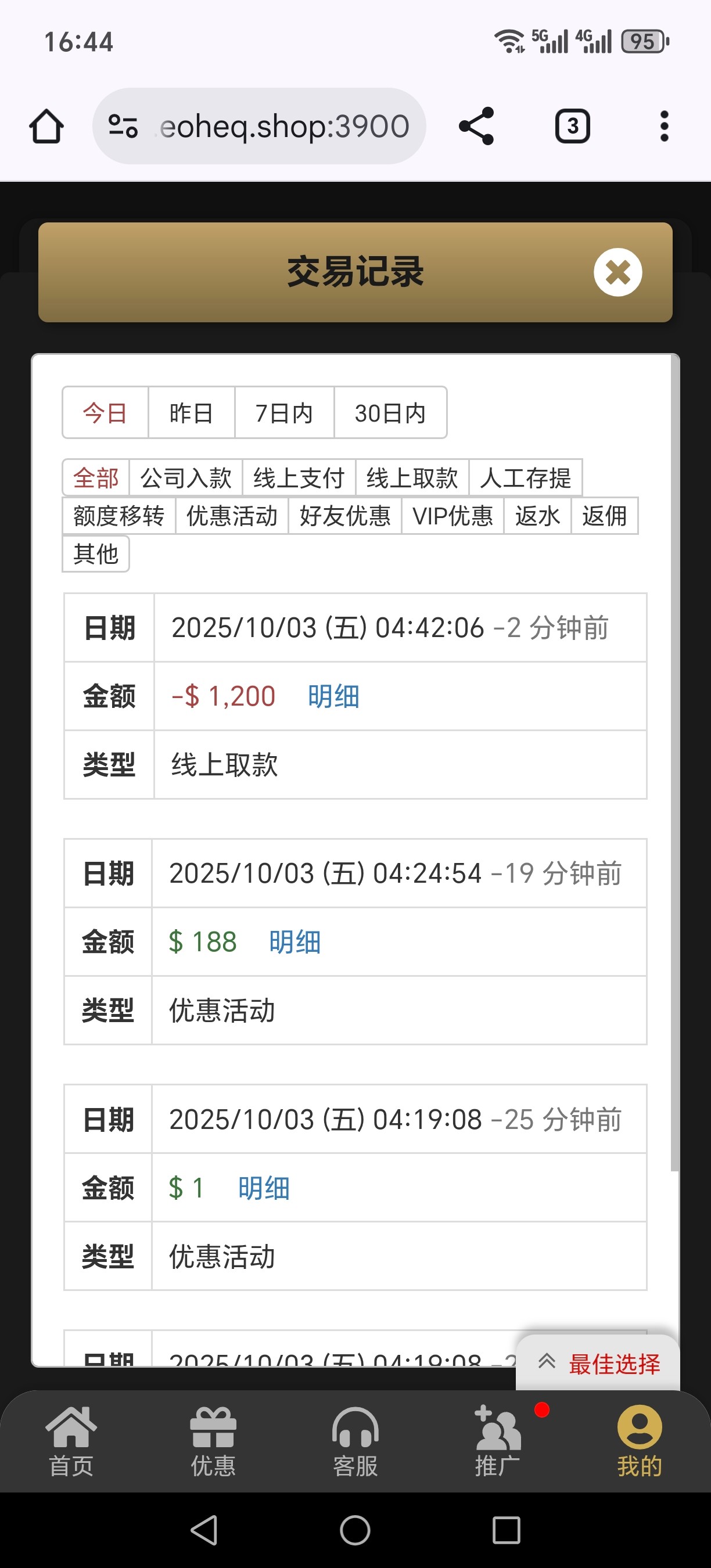 这个台子就是畜生。之前三天吃一千打两千流水一分钱没提。现在这个活动100+188拉2块打400流水,一次免费没进。这个死妈台再充一分钱就是猪狗不如