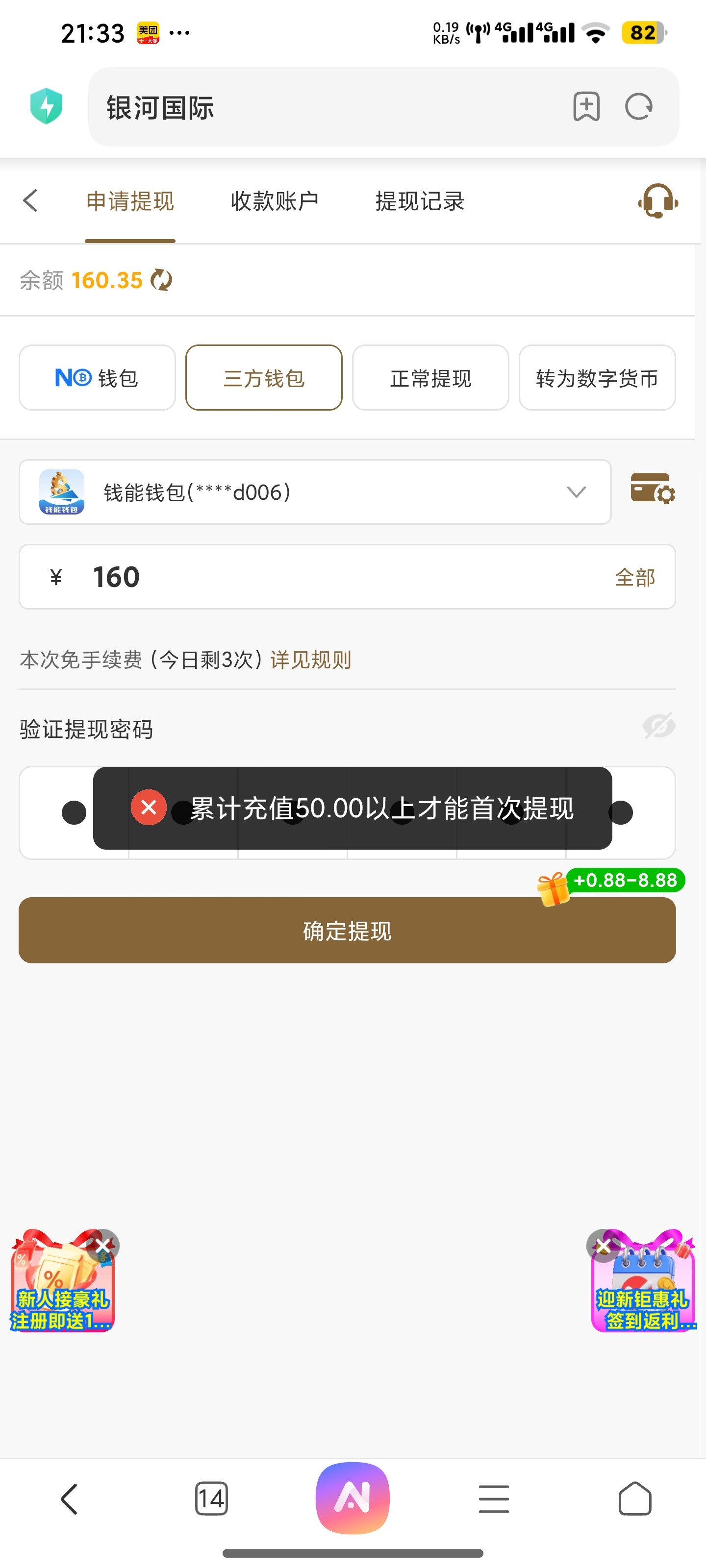 银河国际,这个台子特邀送的。能提吗?提现显示要充值。有玩过的老哥吗说一下