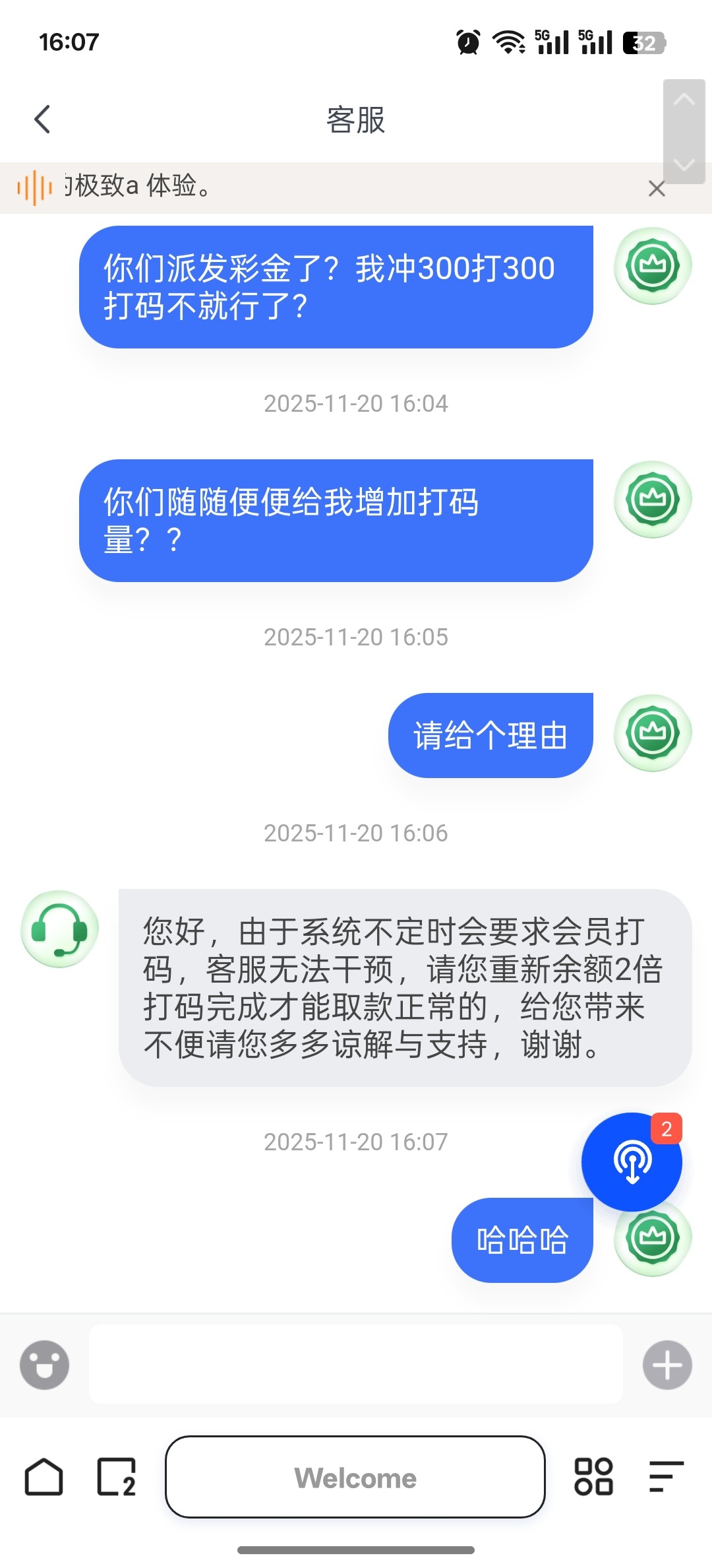 看到帖子说充值300可以领第四次,我问了客服说充值了才能提交能不能领,我冲了之后就说次数满了,然后被要求打了5倍流水才能提现