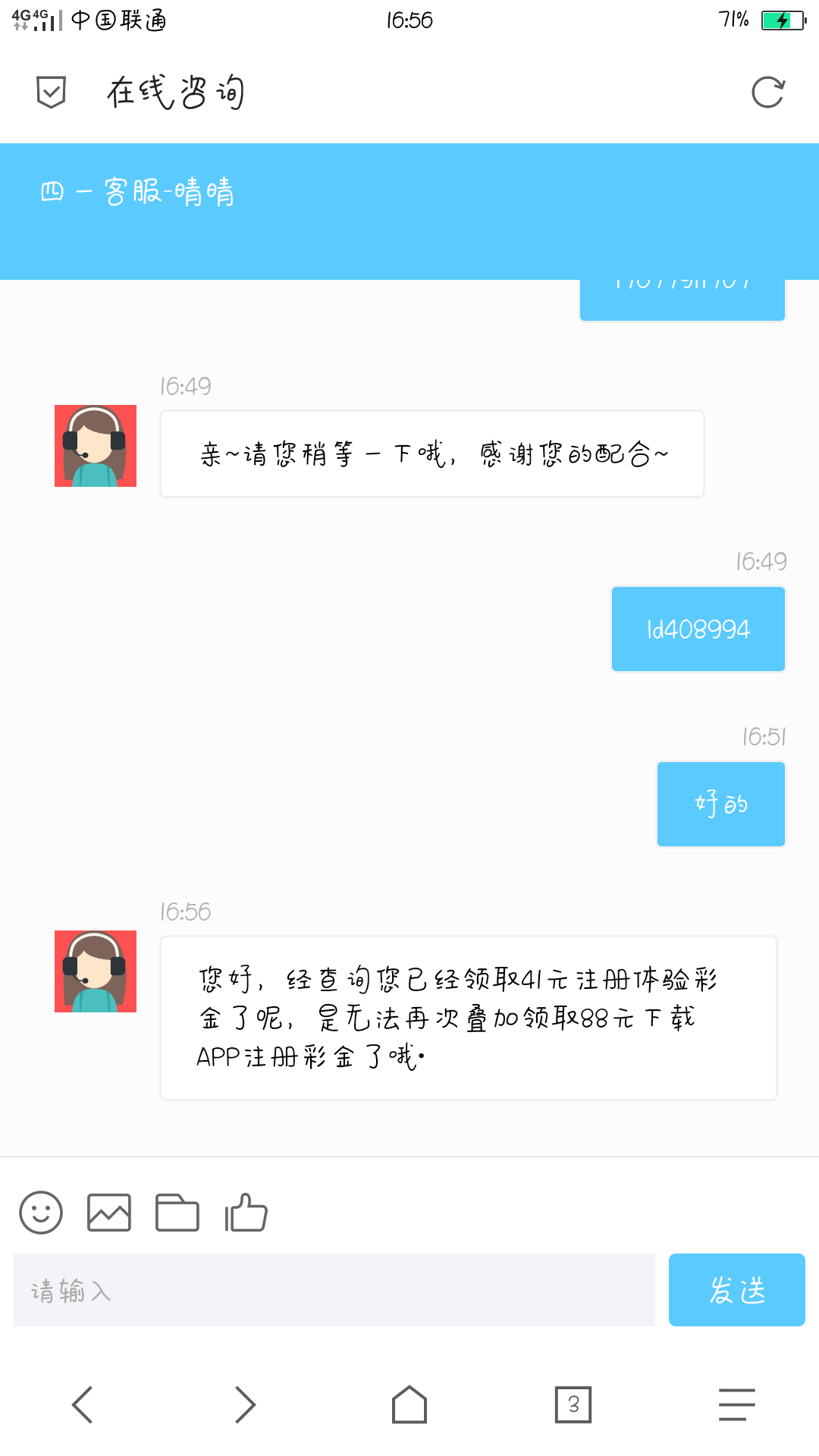 这个客服真的太好了,快把我感动坏了!因为第一次我卡号填写存我按理来说不应该给我提现的!她主动给我改写卡号让我重新提现