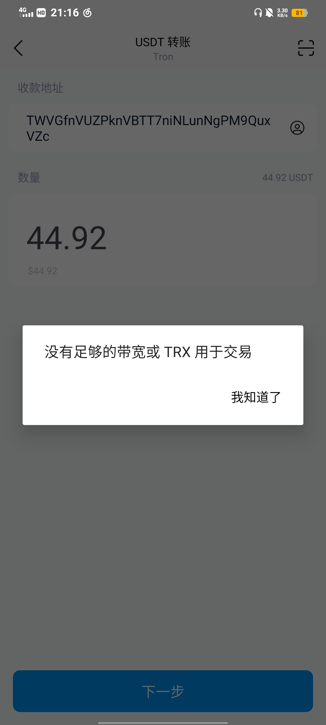 去欧易买20个trx,再复制你这个地址转过去,,再复制你欧易的usdt的trc-20的地址把u转过去再出售