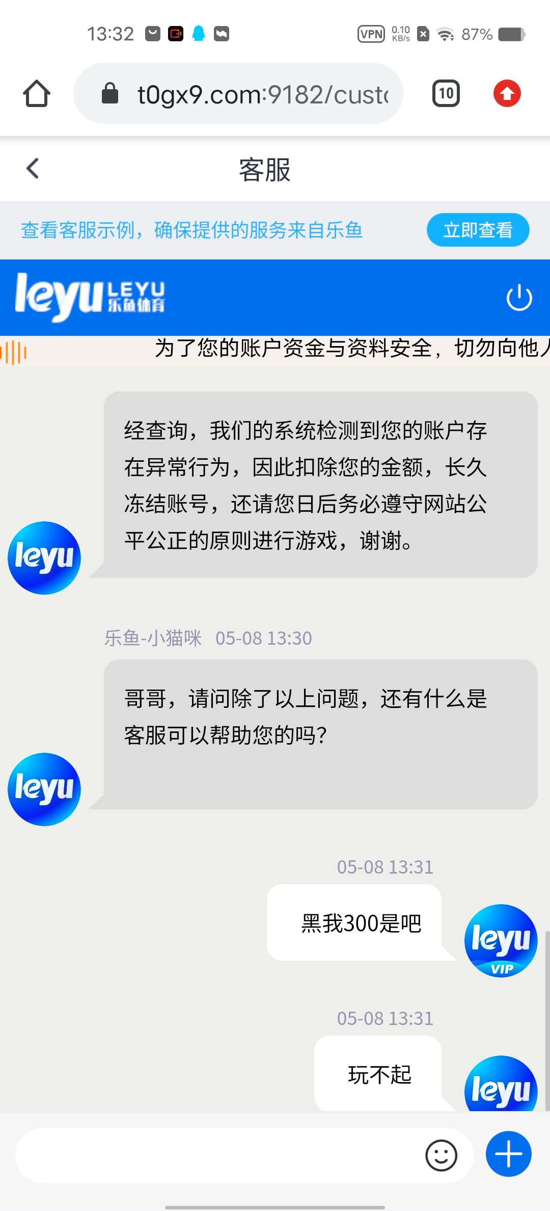 亚博旗下的乐鱼黑了,说的电话回访彩金给了38,然后38打死了,说可以参加100+58的首存,然后提了300,直接冻结账号,本金也不退
