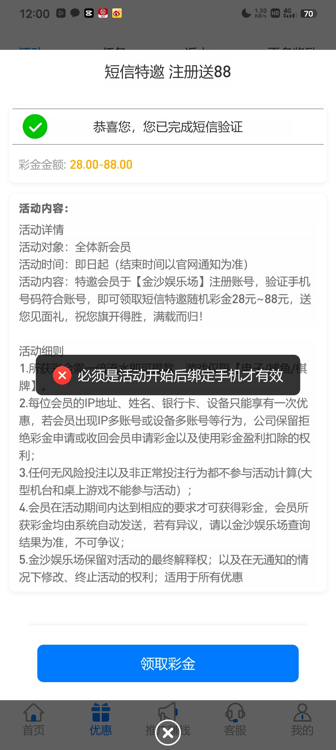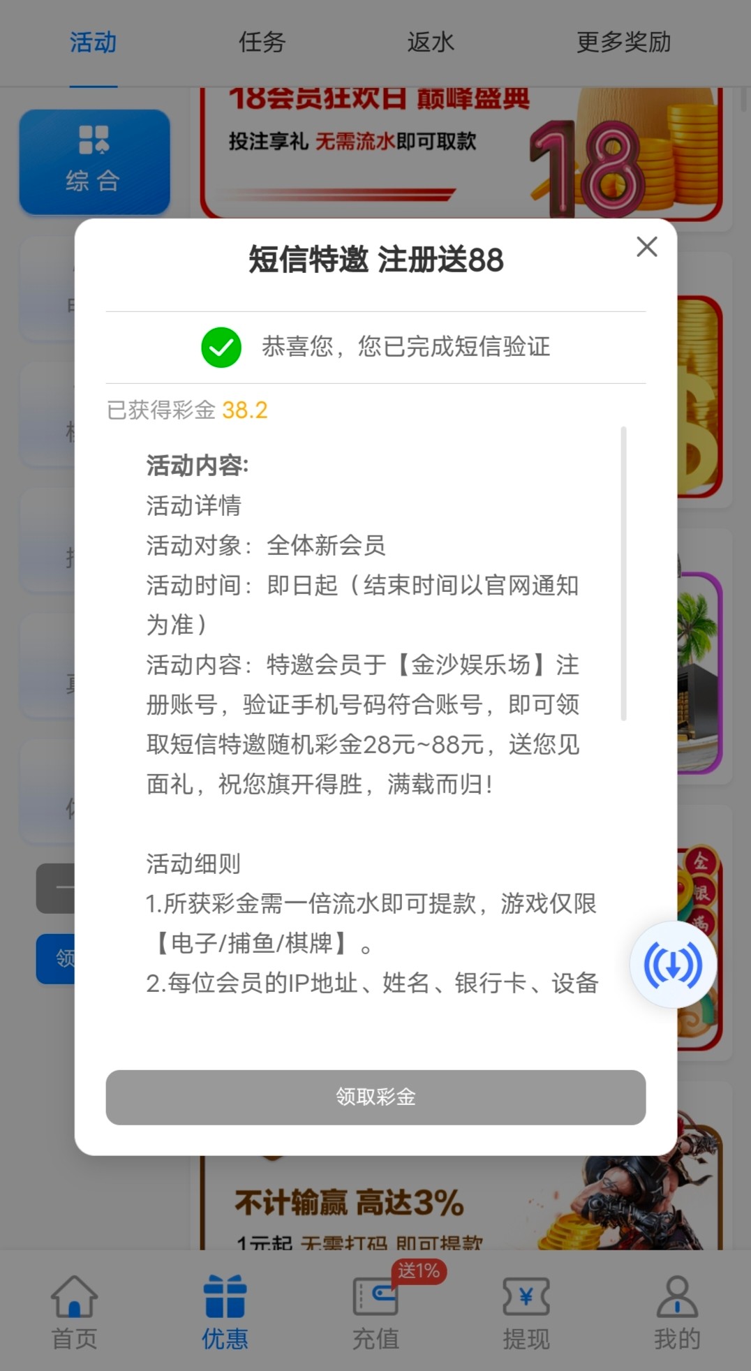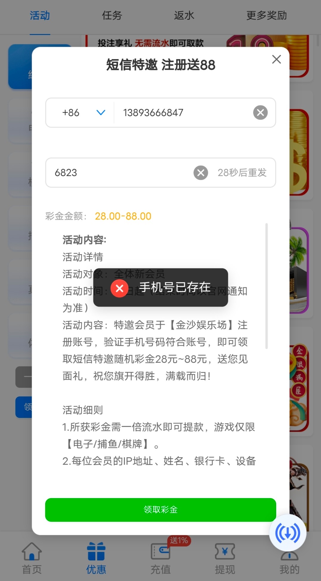 新用户手机号注册优惠大厅自助申请特邀彩金送28-88,没送就是不符合